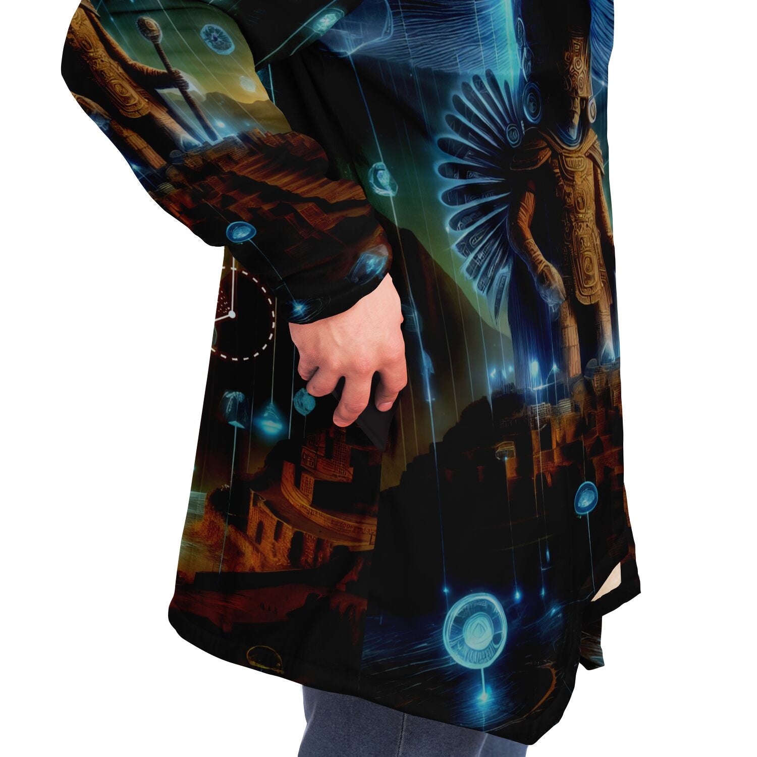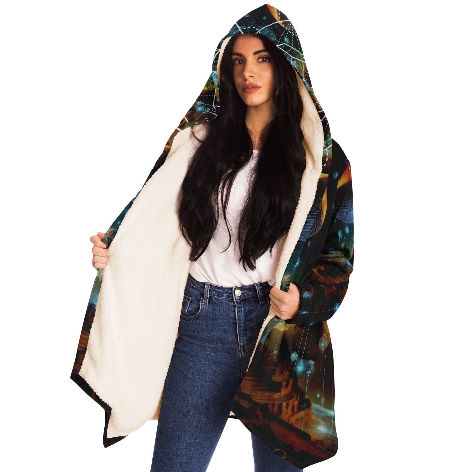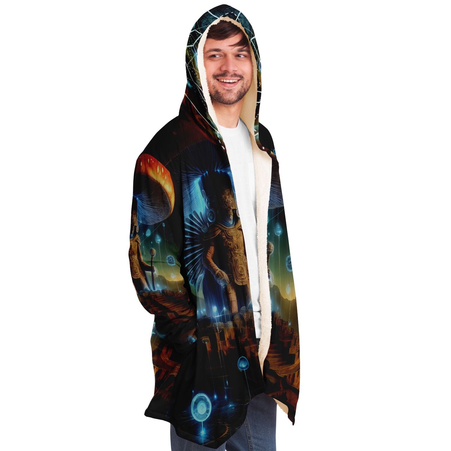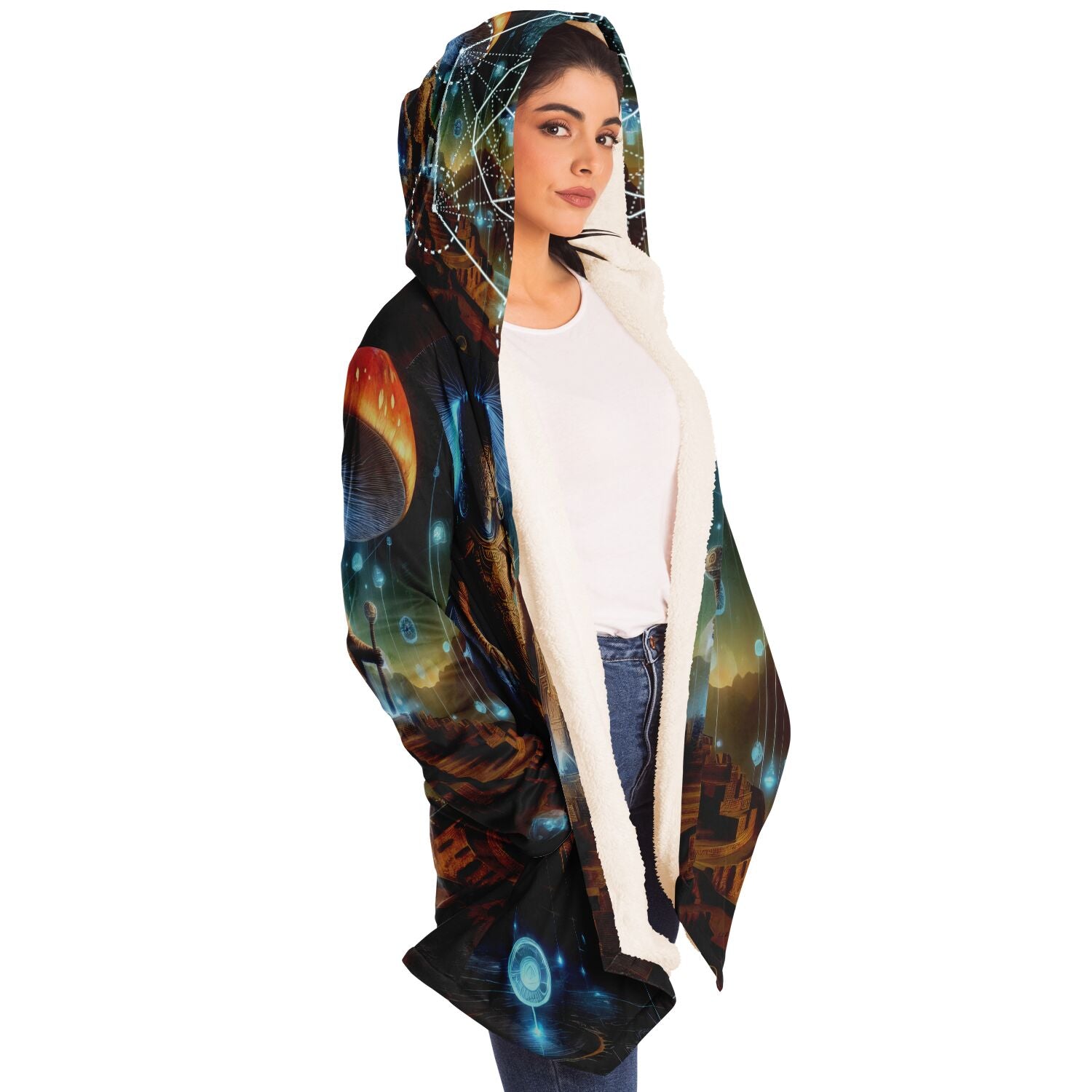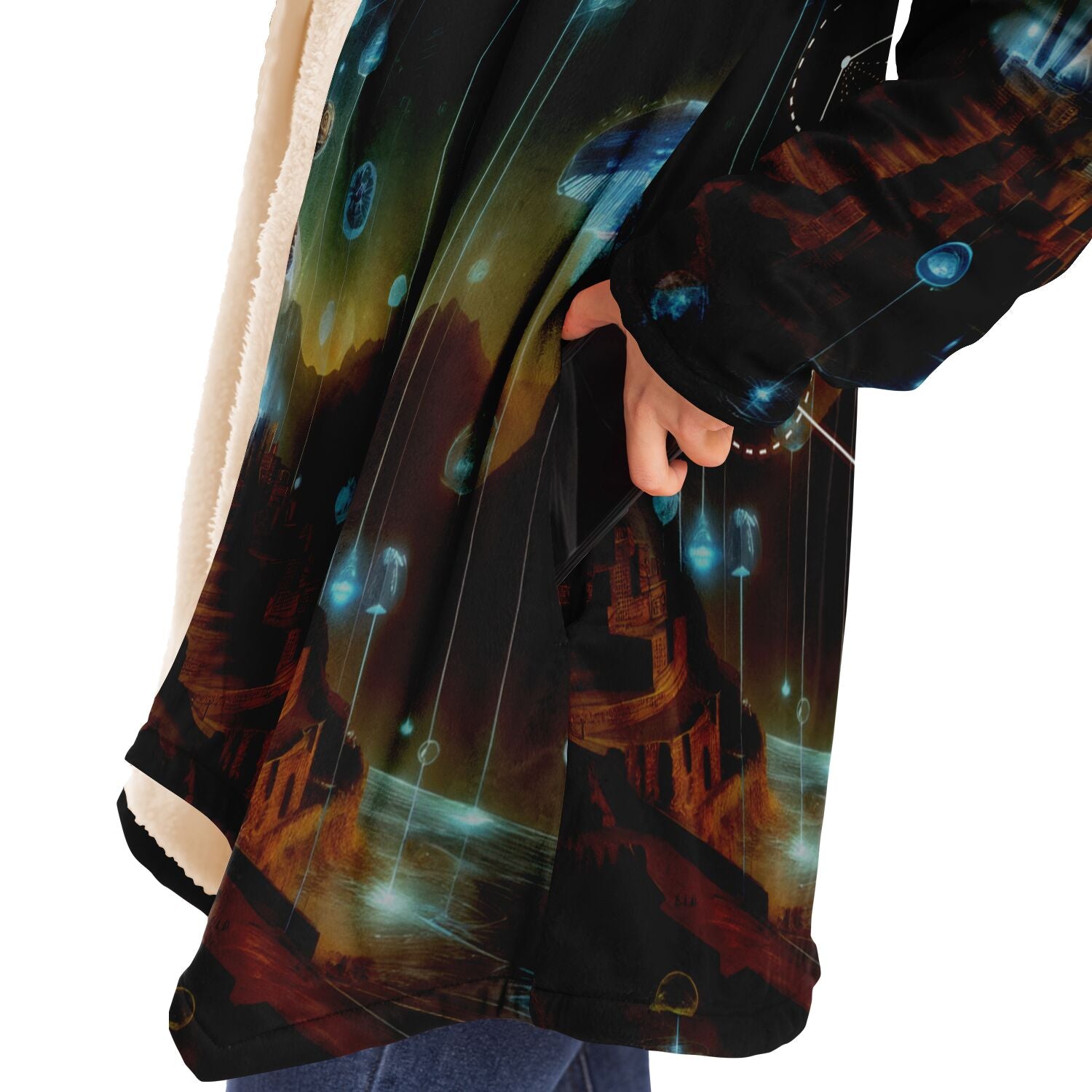 This luxurious cloak is made from an ultra-soft premium microfiber fleece lining. The outside is made with a micro-mink polyester fabric that allows the print to be high definition with vibrant colors. Featuring two deep side pockets to keep your belongings safe and your hands warm.